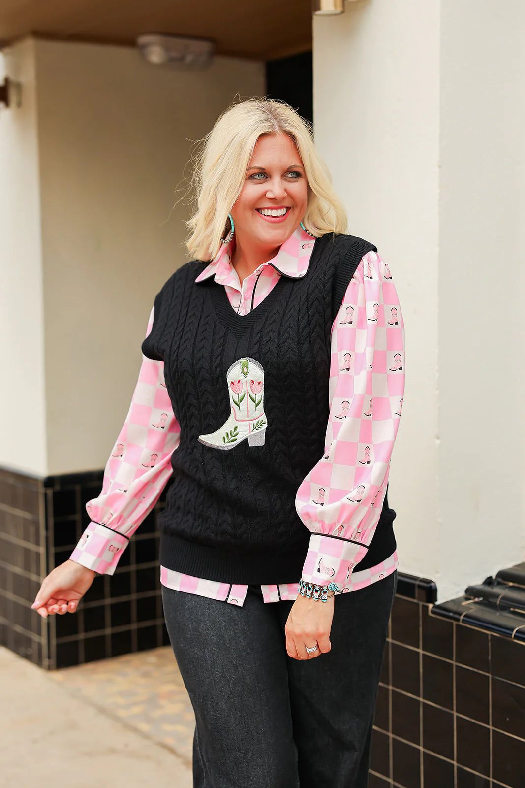 One boot, endless style. The Kodi Vest-black features a fun cable knit style sweater vest with a pink and green boot embroidered on fabric.