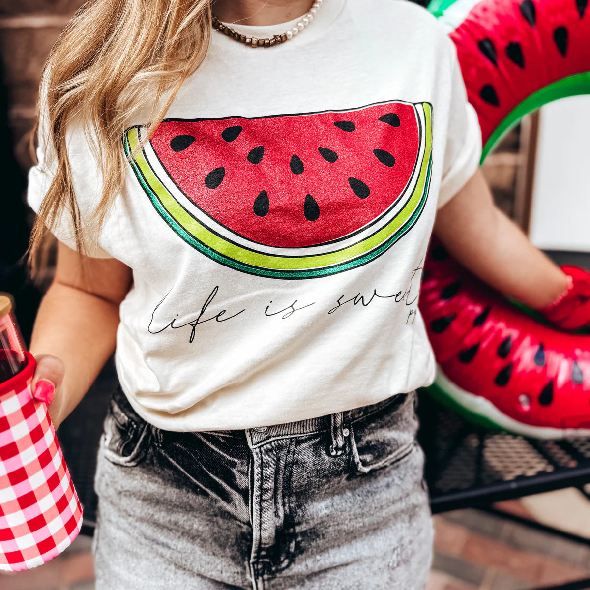 Get ready to sweeten up your wardrobe with our Life is Sweet Watermelon graphic tee! The glittery watermelon design adds a playful touch to this statement shirt, reminding you that life can be as sweet as a juicy watermelon. Life is too short, so why not add some fruity fun to your style?