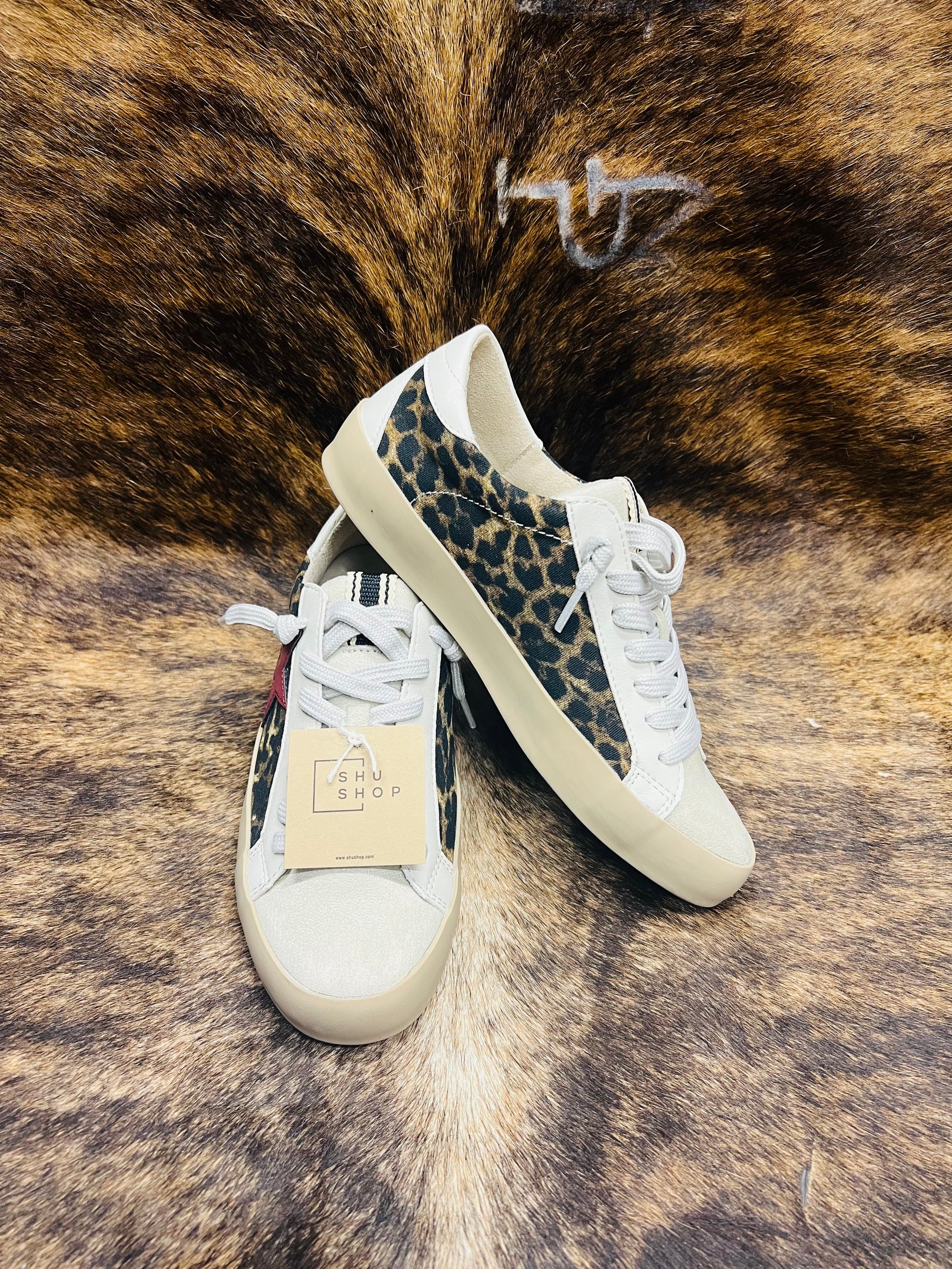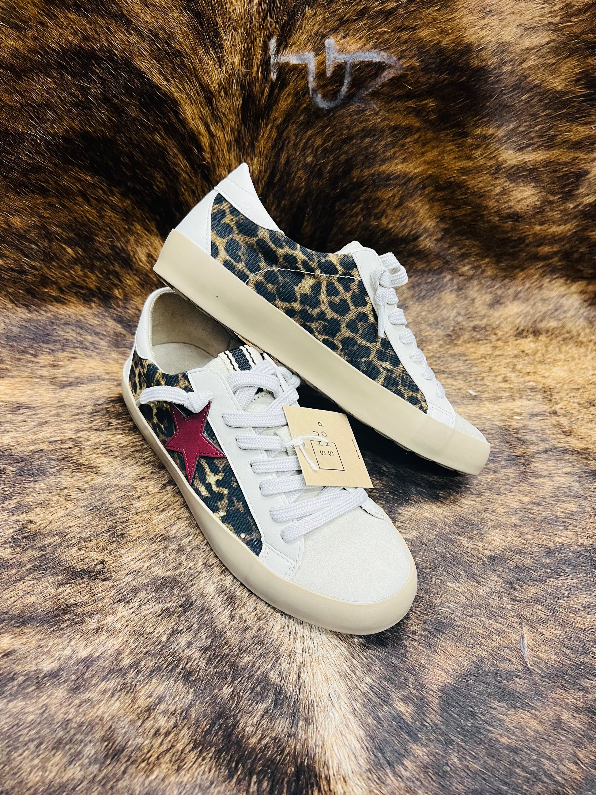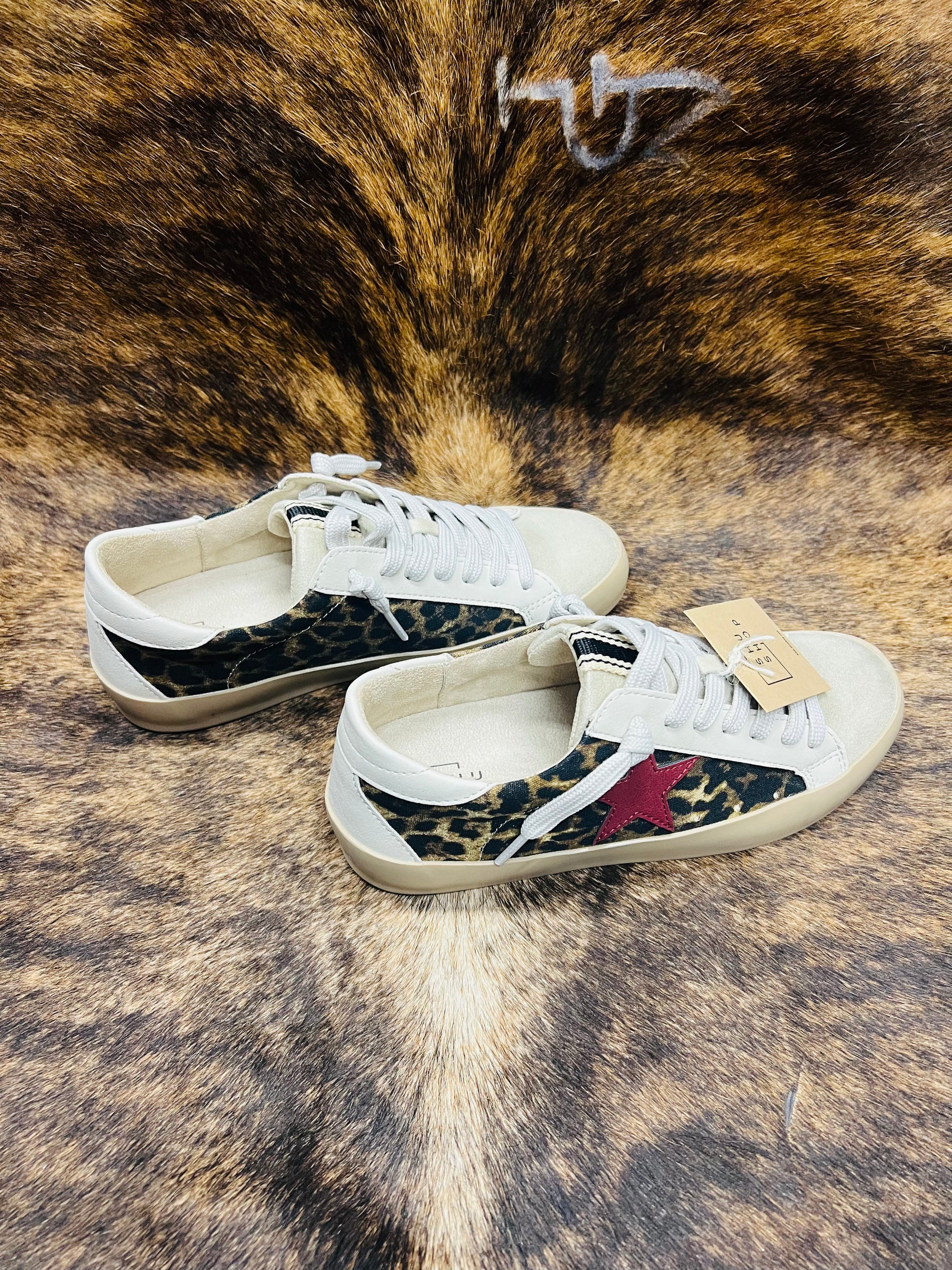 Turn up the attitude with PAULA in bold leopard print. This low-top sneaker combines faux suede and faux leather panels, a contrast burgundy star, and a distressed rubber sole for that vintage-cool vibe. Finished with a soft lining and a removable padded insole, it's the perfect mix of style and comfort for everyday adventures.