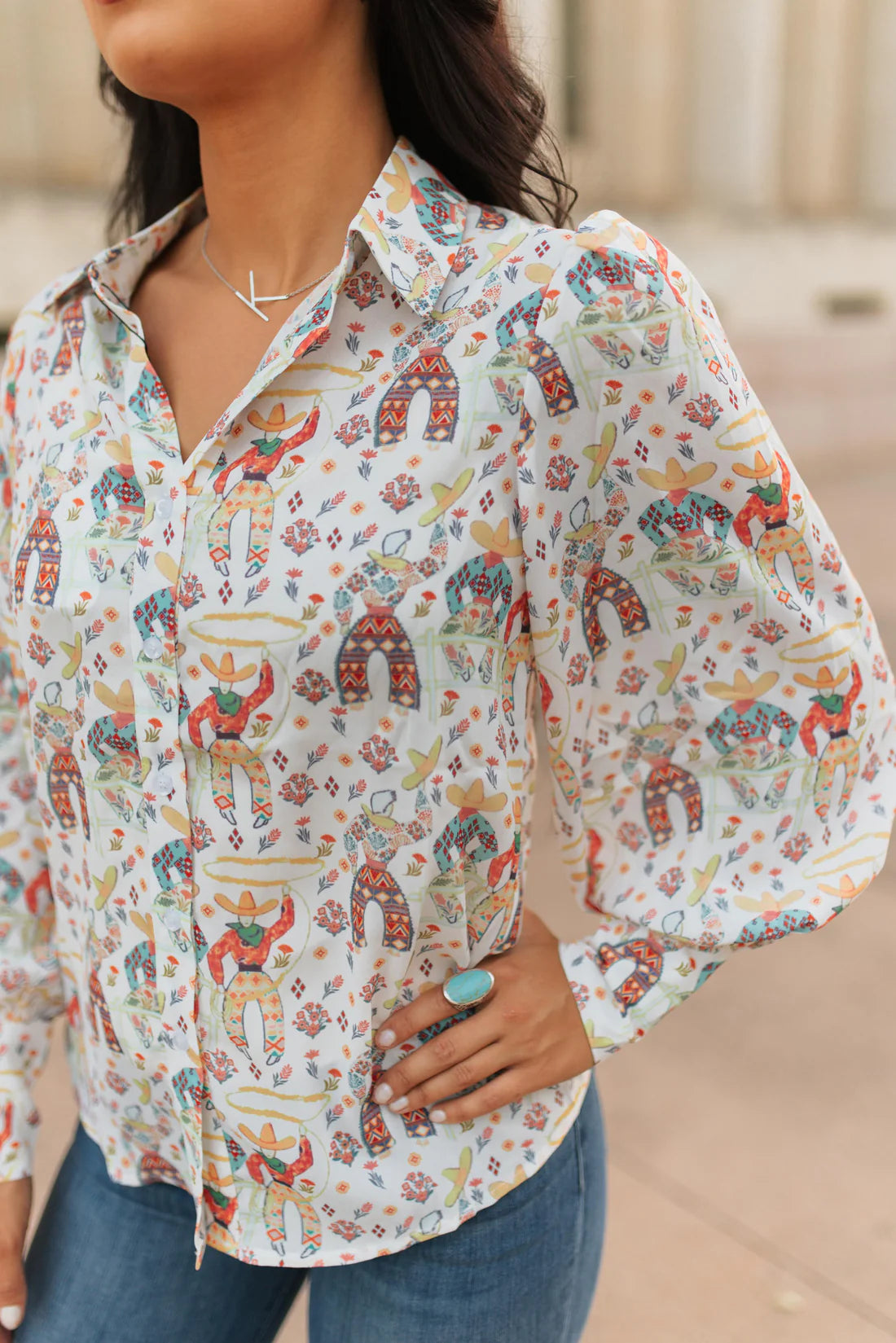 Lightweight button-up blouse in an ivory base, featuring a colorful all-over Western rodeo print with cowboy figures, hats, boots, and lasso motifs in red, turquoise, gold, and earthy tones. Designed with a classic point collar, long sleeves with button cuffs, and a straight hem. Soft woven fabric drapes comfortably for casual wear or boutique Western-themed collections.