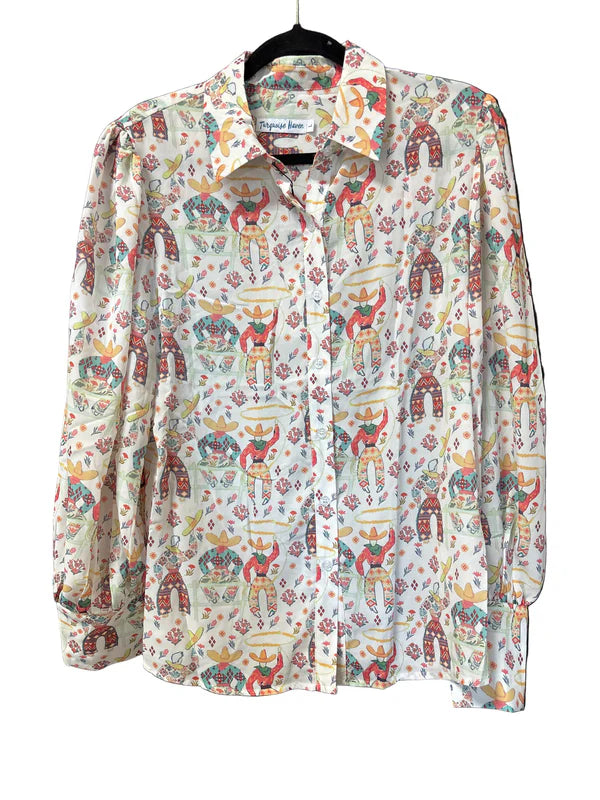 Lightweight button-up blouse in an ivory base, featuring a colorful all-over Western rodeo print with cowboy figures, hats, boots, and lasso motifs in red, turquoise, gold, and earthy tones. Designed with a classic point collar, long sleeves with button cuffs, and a straight hem. Soft woven fabric drapes comfortably for casual wear or boutique Western-themed collections.